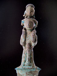 Từ lâu tôi đã chú ý đến những tượng nữ trên cán dao găm Đông Sơn. Việc phân biệt tượng nam hay nữ trên cán dao găm Đông Sơn đã từng được nhiều nhà nghiên cứu quan tâm thảo luận[1], nay nhờ tư liệu phong phú, có thể xác định chúng khá đơn giản và rõ ràng. Trước hết có thể nhận thấy hai loại hình tiêu biểu nhất trong số những tượng phát hiện trong context khảo cổ hoặc của những sưu tập sớm có độ tin cậy cao : những tượng nữ khai quật ở Làng Vạc (Nghệ An), Núi Nưa (Thanh Hoá) và tượng nam ở Núi Đèo (Thuỷ Nguyên), Quả Cảm (Bắc Ninh), Đông Sơn (Thanh Hoá)[2] những tượng trong sưu tập d’Argence hiện trưng bày tại Bảo tàng lịch sử và hai tượng trên cán dao Đông Sơn khai quật được ở nam Trung Quốc[3]. Sự khác biệt của hai nhóm tượng này thể hiện khá rõ và mang tính địa phương. Những tượng Làng Vạc và Núi Nưa thể hiện lối trang phục kín khắp người (áo váy) với thắt lưng dày trên phần eo luôn buông dài tận chân có tua núm và các vòng hạt chuỗi đeo nhiều tầng ở cổ. Các nhà nghiên cứu đều dễ thống nhất đó là đặc trưng tượng nữ, cho dù kiểu đầu tóc ở các tượng có ít nhiều thay đổi. Ở nhóm tượng còn lại, đặc trưng nổi bật nhất là ở trần (hở hai núm vú dẹt) và đóng khố ngắn có tua. Các khố này được trang trí hoa văn và tạo thành hai bản dẹt hình thang phía trước và sau bộ phận sinh dục. Đây là bằng chứng thuyết phục của tượng nam. Từ những tiêu chuẩn này chúng ta có thể nhận ra thêm những đặc điểm trang sức của nam và nữ thời Đông Sơn : ví dụ nữ đeo nhiều vòng chuỗi, khuyên tai, vòng cổ tay lớn và đơn giản trong khi tượng nam đeo khuyên tai gối quạ (Quả Cảm, Hồ Nam...), vòng đeo ở cánh tay... Cũng với những đặc trưng nhận biết này ta có thể nhận ra những tượng „lạ“ được làm không phải theo phong cách Đông Sơn.